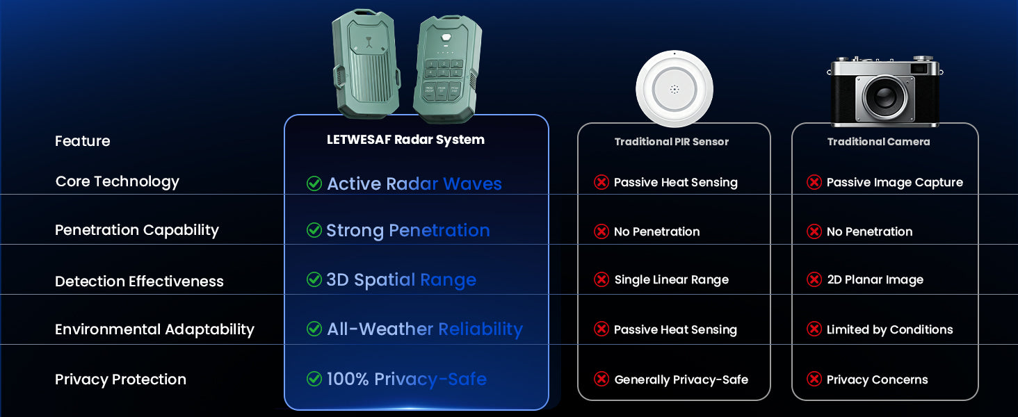 Unlike camera-based systems, LETWESAF uses 24GHz Frequency-Modulated Continuous Wave(FMCW) radar technology — it works in total darkness, rain, or fog, and never records audio or video.